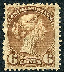 Canada #39. Fresh, sound and fine mint original gum, hinged example of the 1872 issue 6c yellow brown Small Queen. An elusive QV mint issue. 2026 Scott US$600.00 =