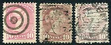 Canada #40a, 40c, 40e. Trio of F/VF used 10c Small Queens in the magenta (1880), dull rose lilac (perf 11.5x12) and pale milkly rose lilac (perf 11.5x12). A lovely group. 2026 Scott US$665.00 =