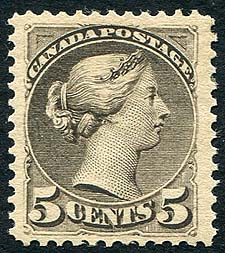 Canada #42. Fresh and F/VF mint OG example Lightly Hinged (1888) printing 5c gray Small Queen. Nice sharp impression. A lovely stamp. 2026 Scott US$210.00 =