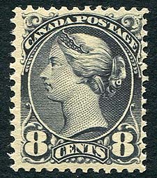 Canada #56. VF mint Never Hinged perfectly centered mint example of the 8c dark violet 1897 issue Queen Victoria Jubilee. Nice even margins all around. Unitrade is $600.00 for VF mint NH. 2026 Scott US$300.00 =