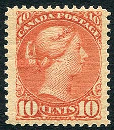 Canada #45. Fine mint, full Original Gum, Never Hinged example of the 10c brown red QV Small Queen. Nice Post Office fresh colour. An elusive NH Small Queen. 2026 Scott US$1,900.00 =