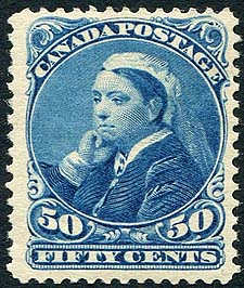 Canada #47. Fine mint Lightly-Hinged example of the 1893-1897 Queen Victoria 50c blue Widow Weeds issue. A very striking stamp, with great colour. 2026 Scott US$400.00 =