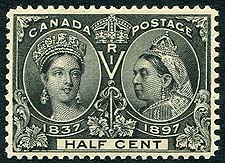 Canada #50. VF mint Never Hinged example of the 1/2c black 1897 Queen Victoria Jubilee issue, with Post Office fresh colour. A very nice example of this issue, minor natural gum bend, mentioned strictly for the record. Unitrade catalogue for VF NH is $450.00. 2026 Scott US$275.00 =