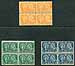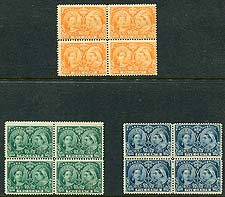 Canada #51, 52, 55. A trio of mint blocks of four from the 1897 Queen Victoria Jubilee series, including the 1c yellow, 2c green and 5c deep blue. The 2c block in Lightly Hinged (all four stamps), while the 1c and 5c blocks are Lightly Hinged on top, Never Hinged on bottom. 2026 Scott US$900.00 =