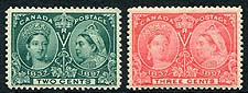 Canada #52, 53. VF mint Never Hinged examples of the 2c green and 3c bright rose, Queen Victoria Jubilee stamps. A nice start to a Never Hinged set. 2026 Scott US$167.50 =