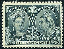 Canada #58. VF mint Never Hinged example of the 15c steel blue 1897 Queen Victoria Jubilee issue. A striking stamp, tougher to find than some of the dollar values from this set, especially as nice as this one with pristine gum. 2025-2026 Unitrade for VF NH is $1350.00. 2026 Scott US$750.00 =