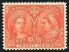 Canada #59. Fresh, well centered and sound VF mint Never Hinged example of the 1897 issue 20c vermilion Jubilee. Great deep shade. Unitrade is $1,350.00 for VF mint NH. 2026 Scott US$750.00 =
