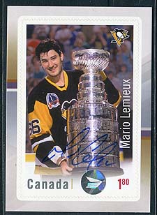 Canada #3037i. Mario Lemieux autographed large format $1.80 peel and stick die-cut "hockey card" stamp with the added holographic Canada Post circular sticker of authenticity. The living hockey players autographed a certain number of these cards with Mario Lemieux doing 500 of these autographed cards. A great hockey topical in perfect condition. These have typically have sold for well over catalogue value. 2025-2026 Unitrade = $400.00