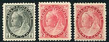 Canada #74, 77, 78. Mint Never Hinged trio of 1898-1899 QV "Numeral" issues, including the 1/2c black, 2c rose carmine and 3c carmine. A nice start to a NH set. 2026 Scott US$385.00 = $519.75