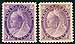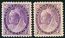 Canada #76, 76ii. F/VF mint Never Hinged examples of the 2c QV 1898 Numeral issue, in both Unitrade listed purple and reddish purple shades. Nice to see these side-by-side! Not acknowledged in Scott, so valued as two basic stamps. Some toning spots noted on the purple shade. 2026 Scott US$200.00 = $270.00