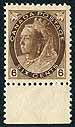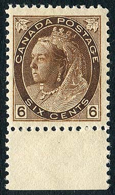 Canada #80. Fresh and Fine/Very Fine mint Never Hinged sheet-margin example of the 1898 issue 6c brown QV "Numeral". Perfect gum and great colour. 2026 Scott US$400.00 = $540.00
