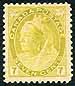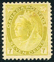 Canada #81. F/VF mint Never Hinged example of the 1898 issued 7c olive yellow QV Numeral issue. A lovely stamp with fresh colour and pristine gum. Small natural paper-inclusion near the Queen's Crown, much more noticeable in the scan than in-hand. 2026 Scott Classic US$300.00 = $405.00