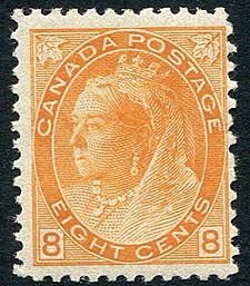 Canada #82. Fine mint Never Hinged example of the 1898 issued 8c orange QV Numeral stamp. Bright Post Office fresh colour, with pristine full original gum. 2026 Scott Classic US$700.00 = $945.00