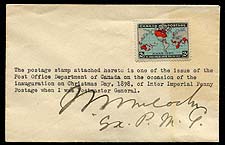 Canada #86. Interesting small envelope, franked with the 1898 Map Stamp, and signed by the designer (and Postmaster General of Canada) Sir William Mulock. A nice "plus value" item to spruce up an album page. Estimate = $100.00