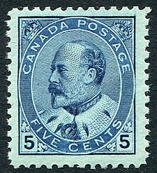 Canada #92. F/VF mint Never Hinged example of the 5c blue on bluish paper 1903 issue Edward. Wonderful colour and pristine gum, a lovely stamp. 2026 Scott US$800.00 = $1,080.00