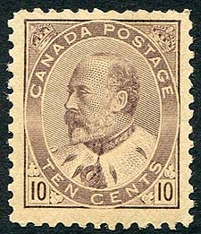 Canada #93i. F/VF mint Never Hinged example of the Unitrade catalogue listed dull lilac shade of the 1903 issue 10c Edward. Not listed in Scott, so valued as the regular issue. 2026 Scott US$1,250.00 = $1,687.50
