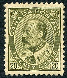 Canada #94. VF centered mint OG hinged / hinged remnant example of the 20c olive green 1904 issue Edward. Unitrade is $1,000.00 for VF mint hinged. An exceptional stamp. 2026 Scott US$750.00 = $1,012.50