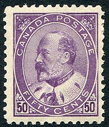 Canada #95. F/VF mint hinged example of the 1908 issue 50c purple Edward high-value. A rare mint stamp, missing from most collections. 2026 Scott US$850.00 = $1,147.50