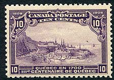 Canada #101. Fresh and F/VF mint Never Hinged example of the 1908 issue 10c dark violet "View of Quebec 1700" from the Quebec Tercentenary set. Pristine and unblemished Original Gum. 2025 Scott US$500.00 = $675.00