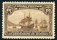 Canada #103. VF mint Never Hinged example of the 1908 issue 20c yellow brown Quebec Tercentenary "Champlain's Arrival" high value. Some gum bends, mentioned "for the record", but overall a great stamp. 2026 Scott US$625.00 = $843.75