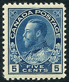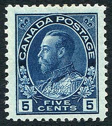 Canada #111a. Very Fine mint Hinged example of the scarce indigo shade of the5c KGV Admiral (1st printing Jan 17, 1912). Considered by many to be the key shade of the key Admiral value. 2026 Scott Classic US$500.00 = $675.00