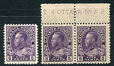 Canada #112, 112a. F/VF mint trio of 5c violet George V Admirals, including the 1922 issued single (wet printing) very Lightly Hinged, and then a sheet-margin (partial inscription) pair of the 1924 issue on Thin Paper (Never Hinged). 2026 Scott US$215.00 = $290.25