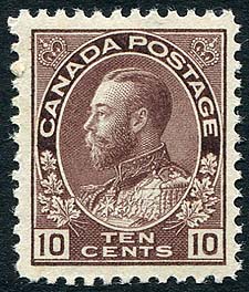 Canada #116. Fresh and Very Fine mint example of the 1912 issue 10c plum George V Admiral. A key Admiral value. While the stamp is Never Hinged, there is a small area of gum loss on the lower left corner, so valued as hinged. 2026 Scott US$275.00 = $371.25