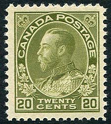 Canada #119. Fresh and F/VF mint Never Hinged example of the 20c olive green GeoV Admiral (dry printing). Great colour and pristine gum. 2026 Scott Classic US$290.00 = $391.50