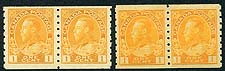 Canada #126, 126d. F/VF mint Never Hinged pair duo of both "Dry" and "Wet" printings of the 1c George V Admiral, in yellow-orange and yellow shades. Nice to get both these printings at once. 2026 Scott US$130.00 = $175.50