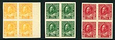 Canada #136-138. Complete set of VF mint Lightly Hinged (top) / Never Hinged (bottom) blocks of four of the 1924 issue Admirals imperforates. 2025-2026 Unitrade is $750.00 for the blocks. 2026 Scott US$525.00 = $708.75
