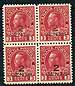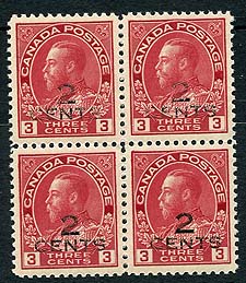 Canada #140 Variety. VF mint Never Hinged block of four of the "2 CENTS" 1926 Admiral surcharge issue, with significant under-inking. Not listed, so catalogue value is for 4x mint NH singles. 2026 Scott US$250.00 = $337.50