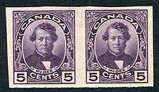 Canada #146a. VF mint Never Hinged imperforate pair of the 5c violet McGee commemorative from the popular 1927 "Historical" series. Only 250 pairs issued, with few of the remaining pairs as nice as this. Unitrade catalogue is $240.00 for a VF mint NH imperf pair. Undervalued in our opinion. 2026 Scott US$180.00 = $243.00