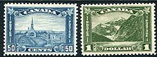Canada #176, 177. Fresh and Fine mint Lightly Hinged examples of the 1930 issue dull blue 50c Grand Pre and dark olive green $1.00 Cavell high values from the GeoV Arch series. 2026 Scott US$350.00 = $472.50