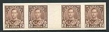 Canada #212 Plate Proof Gutter Strip. VF and extremely scarce horizontal gutter-strip of four of the 2c Duke of York, 1935 Silver Jubilee issue Plate Proof. The 1c, 2c and 5c values sheets were printed in 4 panes of 100, therefore only 32 possible horizontal gutter strips are possible. Unitrade values a gutter strip of 8 stamps, so we have pro-rated the catalogue value here. 2025-2026 Unitrade = $600.00