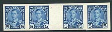 Canada #214 Plate Proof Gutter Strip. VF and extremely scarce horizontal gutter-strip of four of the 5c Prince of Wales, 1935 Silver Jubilee issue Plate Proof. The 1c, 2c and 5c values sheets were printed in 4 panes of 100, therefore only 32 possible horizontal gutter strips are possible. Unitrade values a gutter strip of 8 stamps, so we have pro-rated the catalogue value here. 2025-2026 Unitrade = $600.00