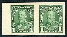 Canada #217c. VF mint Lightly Hinged sheet-margin imperforate pair of the 1c green, George V Pictorial series stamp. Only 150 pairs exist, extremely undervalued in the catalogue. The first we have handled. 2026 Scott US$250.00 = $337.50
