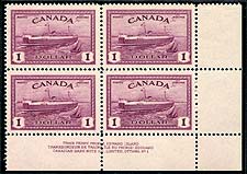 Canada #273. VF mint upper-left inscription block (Plate #1) of the 1946 Peace issue $1.00 Train Ferry. Lightly hinged in the selvedge and on one stamp only. Catalogued as a VF mint Hinged plate block. 2025-2026 Unitrade = $250.00