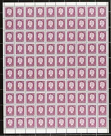 Canada #926A. Full VF mint Never Hinged sheet of 100 of the 1987 issue 36c plum QEII definitive. These stamps had a very short period of use (3 months) before the rate went up. Only issued with blank (field stock) corners. Full sheets are getting quite scarce! 2025-2026 Unitrade = $416.00
