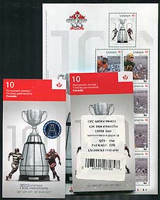 Canada #2568, BK499-BK507, BK516a. Complete set, still in Post Office packaging of the 2012 CFL Teams issue (9 complete booklets of 10x "P" stamps), plus the souvenir sheet of 9 stamps, and the 100th Grey Cup Game Winners (Toronto Argonauts) booklet. Tough to find! Face value alone is $135.16. 2025-2026 Unitrade = $297.50