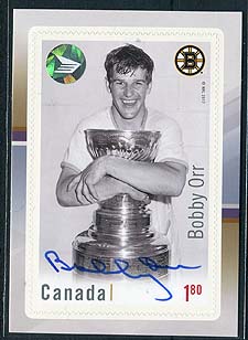 Canada #3036i. Bobby Orr autographed large format $1.80 peel and stick die-cut "hockey card" stamp with the added holographic Canada Post circular sticker of authenticity. The living hockey players autographed a certain number of these cards with Bobby Orr doing 2000 of these autographed cards. A great hockey topical in perfect condition. These have typically have sold for well over catalogue value. 2025-2026 Unitrade = $250.00