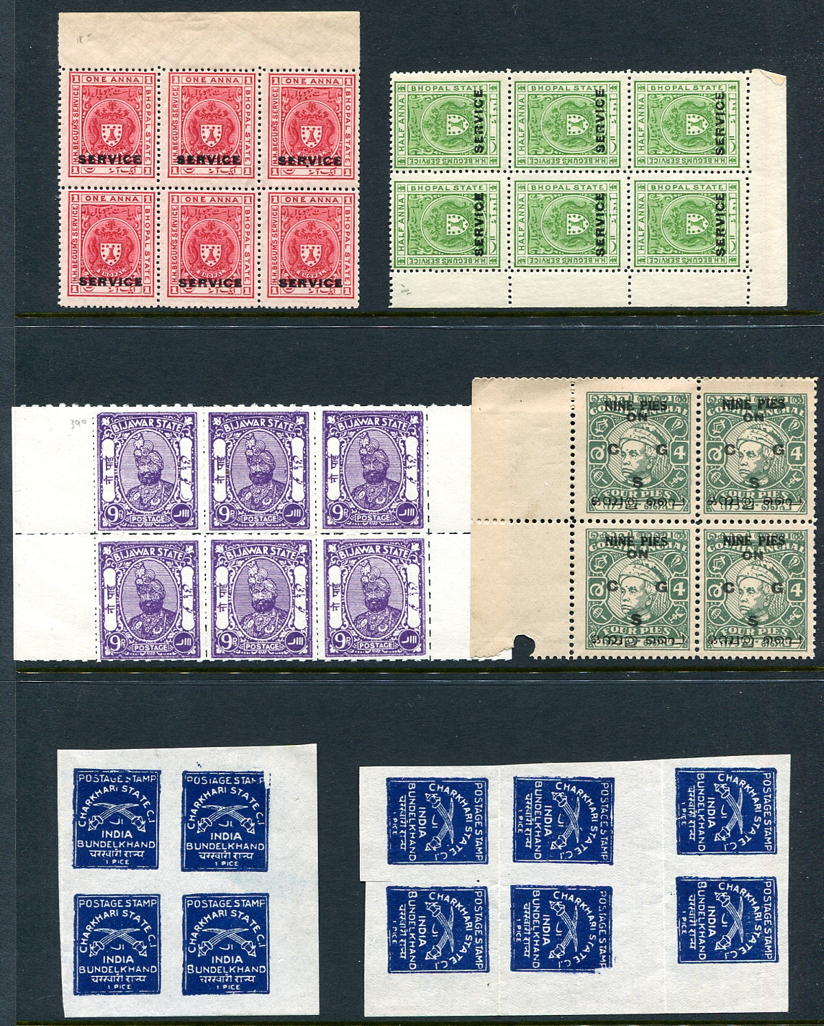 Old-time holding of mint blocks / multiples, neatly arranged on two stockpages with stamples from Travencore, Morvi, Cochin, Bijawar, Charkhari and Bhopal State. All mint Never Hinged (or no-gum as issues) with the exception of the Morvi State block of 12, which has two hinge re-enforcements. An interesting assembly. 2025 Scott US$568.40 =