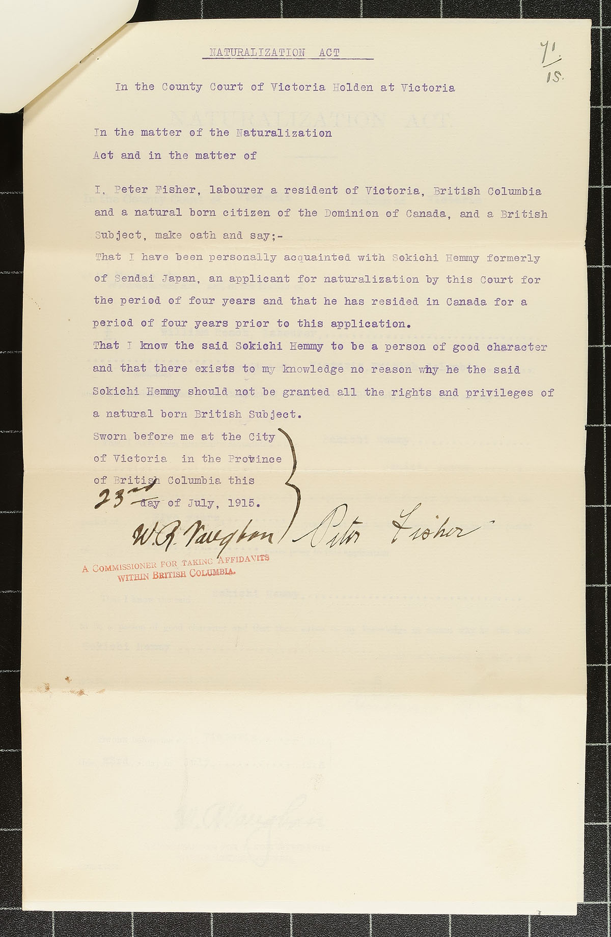 A duo of document sets, each bearing an example of the 25c green British Columbia Law Stamp from the 1905-1912 Fourth Series. Each set of documents features five pages (Law Stamp on the front page), relating to the Naturalization of two individuals into the Province. The first for Walter Freiman 1914 formerly of "Libau, Baltic Russia" (Latvia) and the second for Sokichi Henry 1915 formerly of "Sendai Japan". Both processed in Victoria BC. Interesting historical documents. van Dam catalogue notes "documents scarce". Estimate =