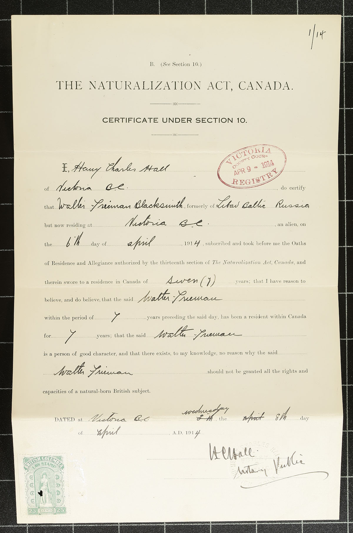 A duo of document sets, each bearing an example of the 25c green British Columbia Law Stamp from the 1905-1912 Fourth Series. Each set of documents features five pages (Law Stamp on the front page), relating to the Naturalization of two individuals into the Province. The first for Walter Freiman 1914 formerly of "Libau, Baltic Russia" (Latvia) and the second for Sokichi Henry 1915 formerly of "Sendai Japan". Both processed in Victoria BC. Interesting historical documents. van Dam catalogue notes "documents scarce". Estimate =