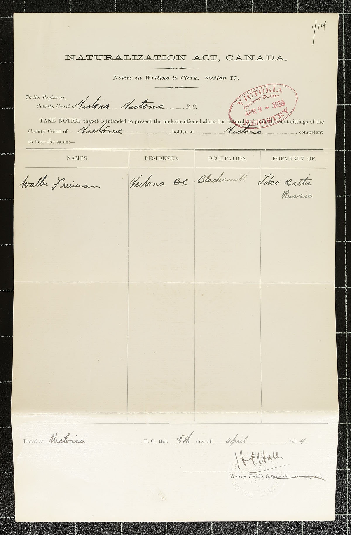 A duo of document sets, each bearing an example of the 25c green British Columbia Law Stamp from the 1905-1912 Fourth Series. Each set of documents features five pages (Law Stamp on the front page), relating to the Naturalization of two individuals into the Province. The first for Walter Freiman 1914 formerly of "Libau, Baltic Russia" (Latvia) and the second for Sokichi Henry 1915 formerly of "Sendai Japan". Both processed in Victoria BC. Interesting historical documents. van Dam catalogue notes "documents scarce". Estimate =