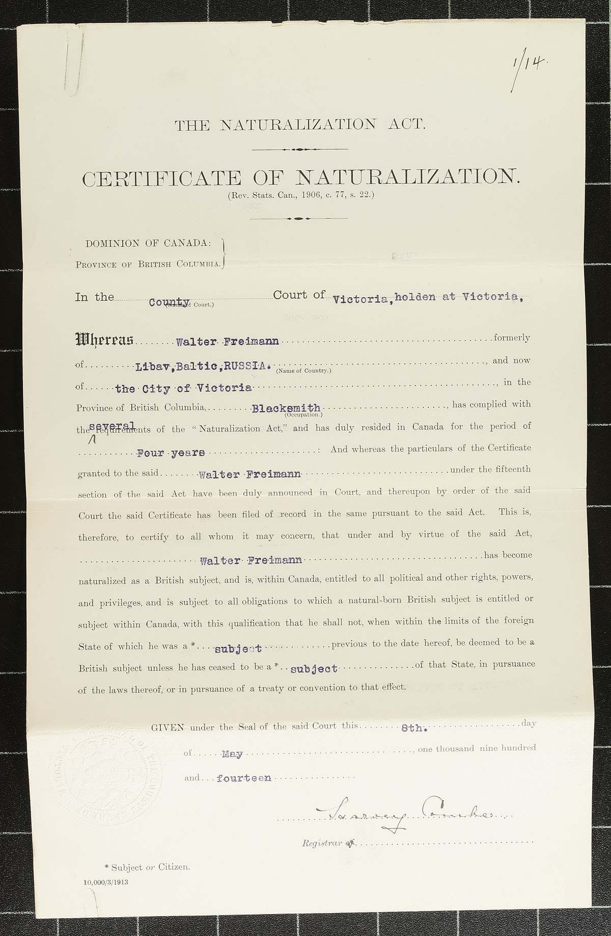 A duo of document sets, each bearing an example of the 25c green British Columbia Law Stamp from the 1905-1912 Fourth Series. Each set of documents features five pages (Law Stamp on the front page), relating to the Naturalization of two individuals into the Province. The first for Walter Freiman 1914 formerly of "Libau, Baltic Russia" (Latvia) and the second for Sokichi Henry 1915 formerly of "Sendai Japan". Both processed in Victoria BC. Interesting historical documents. van Dam catalogue notes "documents scarce". Estimate =