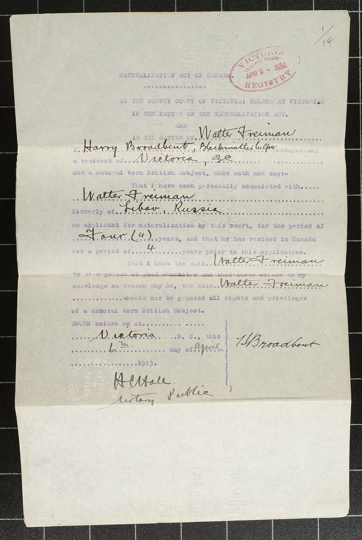 A duo of document sets, each bearing an example of the 25c green British Columbia Law Stamp from the 1905-1912 Fourth Series. Each set of documents features five pages (Law Stamp on the front page), relating to the Naturalization of two individuals into the Province. The first for Walter Freiman 1914 formerly of "Libau, Baltic Russia" (Latvia) and the second for Sokichi Henry 1915 formerly of "Sendai Japan". Both processed in Victoria BC. Interesting historical documents. van Dam catalogue notes "documents scarce". Estimate =