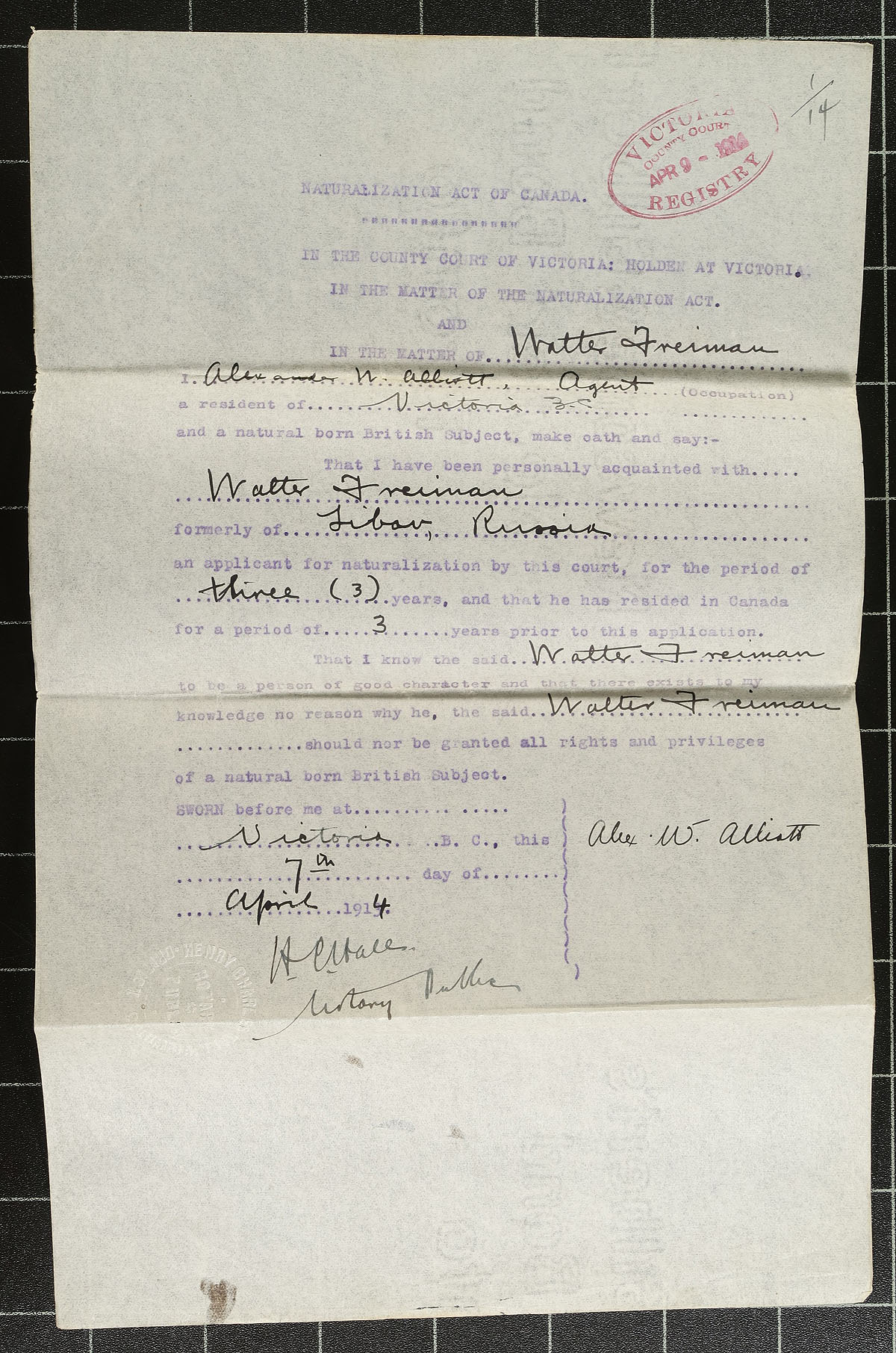 A duo of document sets, each bearing an example of the 25c green British Columbia Law Stamp from the 1905-1912 Fourth Series. Each set of documents features five pages (Law Stamp on the front page), relating to the Naturalization of two individuals into the Province. The first for Walter Freiman 1914 formerly of "Libau, Baltic Russia" (Latvia) and the second for Sokichi Henry 1915 formerly of "Sendai Japan". Both processed in Victoria BC. Interesting historical documents. van Dam catalogue notes "documents scarce". Estimate =