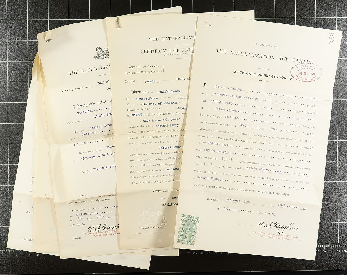 A duo of document sets, each bearing an example of the 25c green British Columbia Law Stamp from the 1905-1912 Fourth Series. Each set of documents features five pages (Law Stamp on the front page), relating to the Naturalization of two individuals into the Province. The first for Walter Freiman 1914 formerly of "Libau, Baltic Russia" (Latvia) and the second for Sokichi Henry 1915 formerly of "Sendai Japan". Both processed in Victoria BC. Interesting historical documents. van Dam catalogue notes "documents scarce". Estimate =