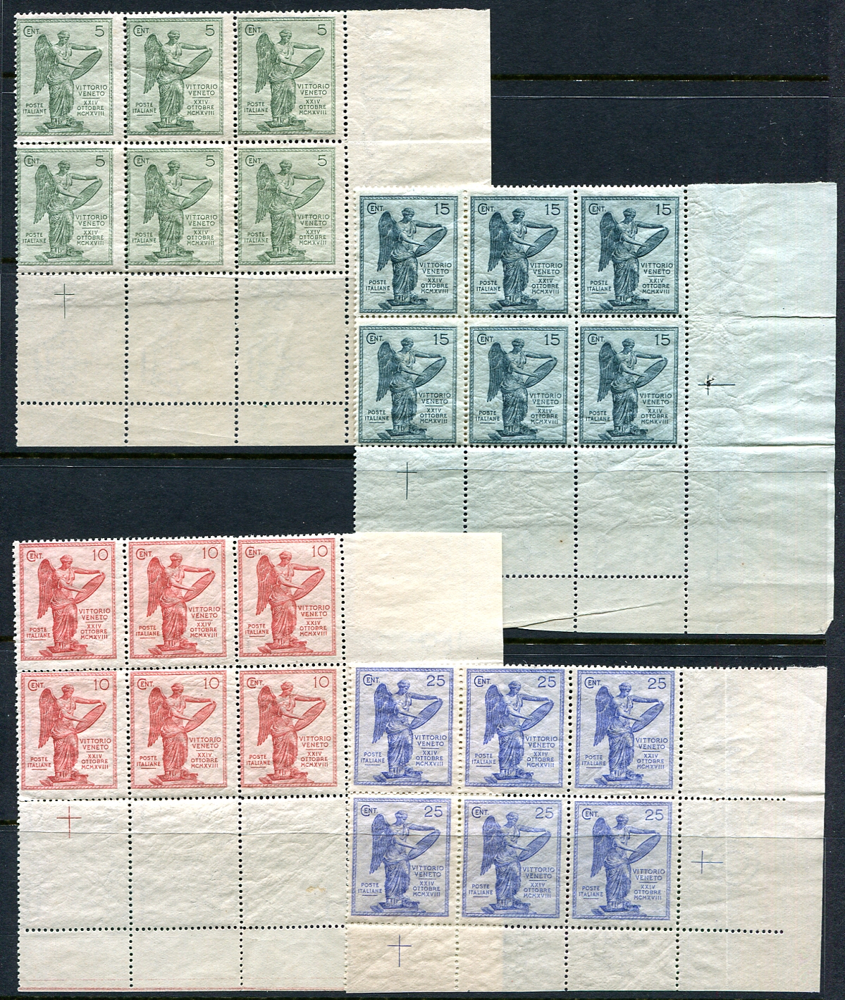 Complete mint Never Hinged set of the 1921 "Victory" issue, in lower-right selvedge corner blocks of 6. Striking appearance, with the usual "crackling" of the gum. 2024 Scott Classic US$324.00 =