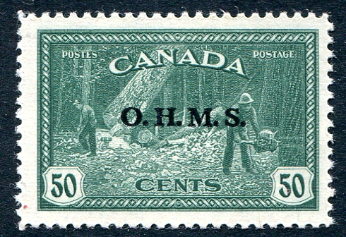 F/VF mint Never Hinged example of the 1949 issue OHMS official overprint on the 50c "Lumbering". This is the key overprinted Official, with only 50,000 printed. 2025 Scott US$245.00 =